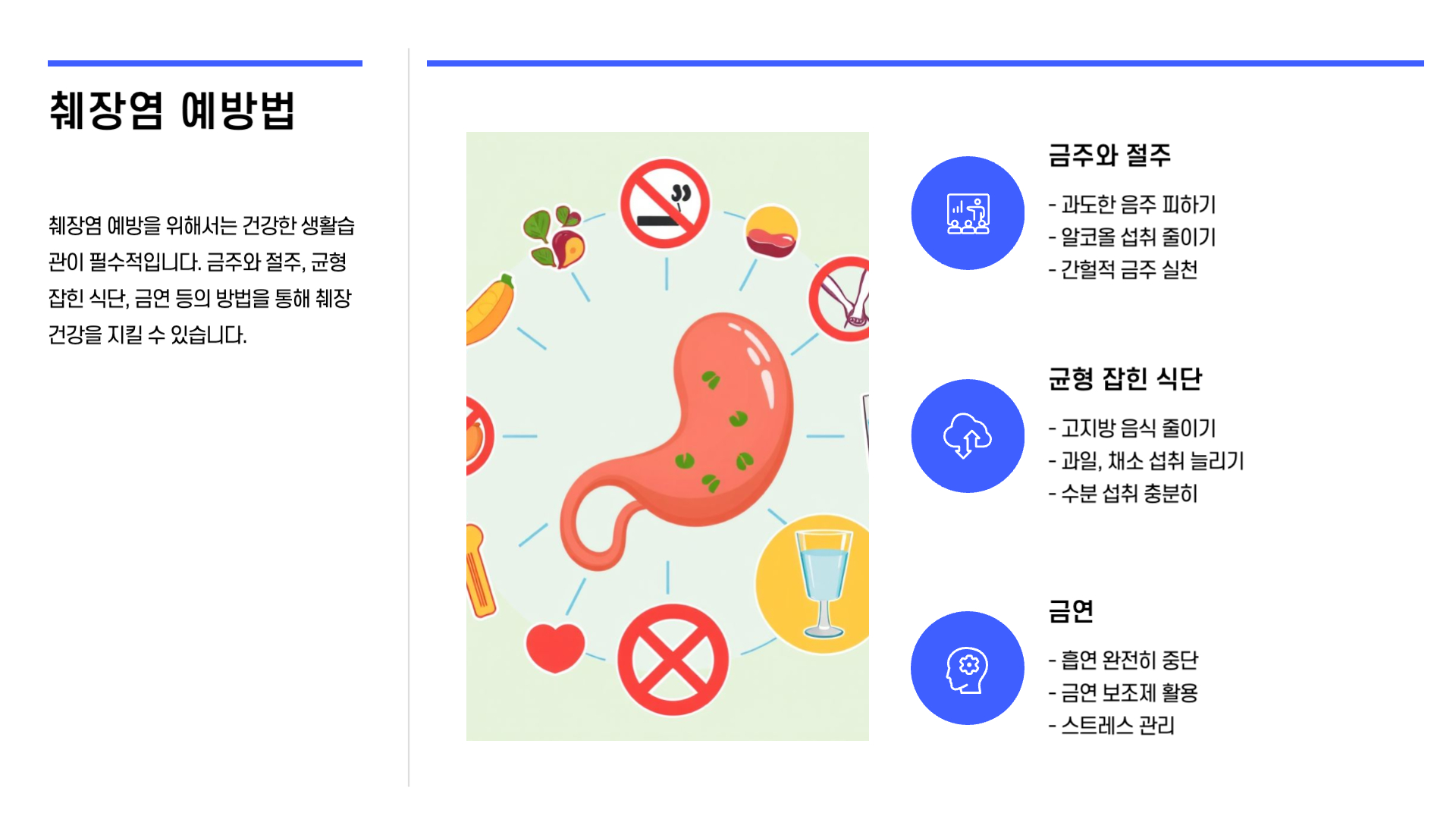 - 금주: 과도한 음주는 췌장염의 주요 원인 중 하나이므로 피하는 것이 중요합니다.