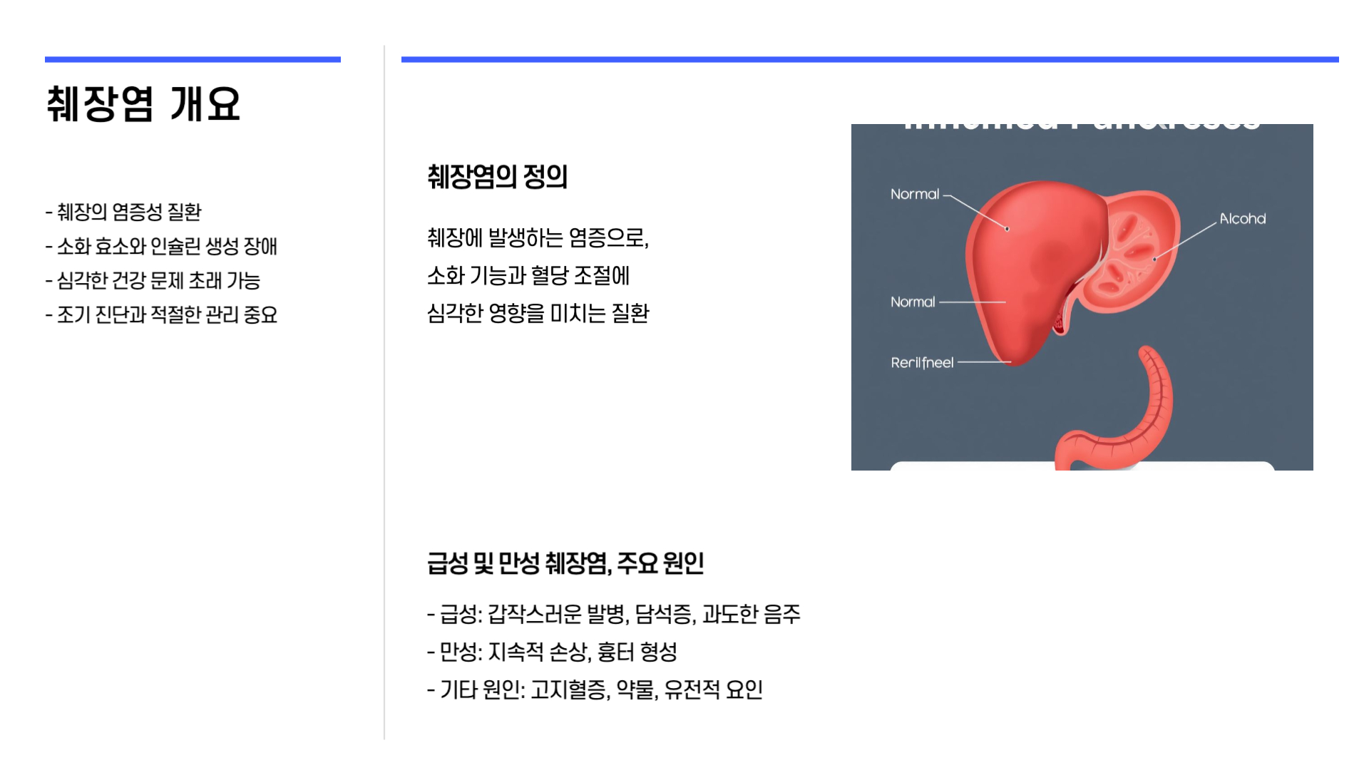 췌장염은 췌장에 염증이 발생하는 질환으로, 급성(단기간)과 만성(장기간 지속)으로 나뉩니다. 췌장은 소화를 돕는 효소와 혈당 조절에 중요한 인슐린을 생성하는 기관으로, 염증이 발생하면 기능이 손상되어 심각한 건강 문제를 초래할 수 있습니다.