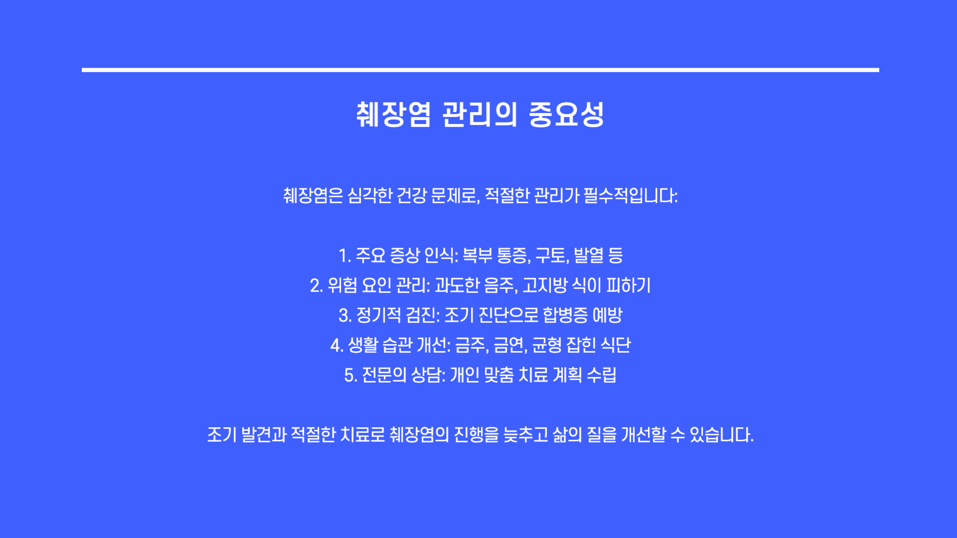 췌장염은 조기에 발견하고 관리하는 것이 중요합니다. 특히 급성 췌장염은 응급 상황을 초래할 수 있으므로 증상이 나타나면 빠르게 병원을 방문해야 합니다. 만성 췌장염의 경우 생활 습관 개선과 지속적인 관리가 필수적입니다. 건강한 식습관과 예방적인 생활 습관을 통해 췌장 건강을 지키세요!
