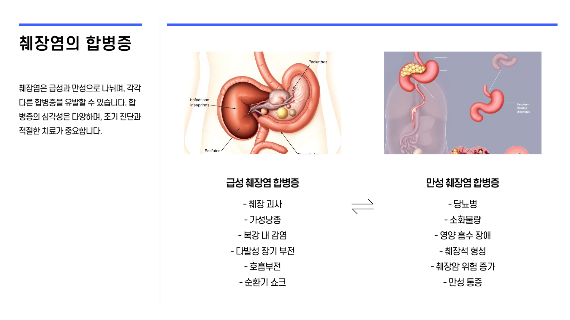 급성 췌장염은 대개 갑작스럽게 발생하며, 담석증과 과도한 음주가 주요 원인입니다. 반면, 만성 췌장염은 지속적인 손상으로 인해 췌장 조직이 흉터로 대체되면서 발생합니다. 적절한 치료가 이루어지지 않을 경우 당뇨병, 영양 흡수 장애 및 심각한 합병증으로 이어질 수 있습니다.