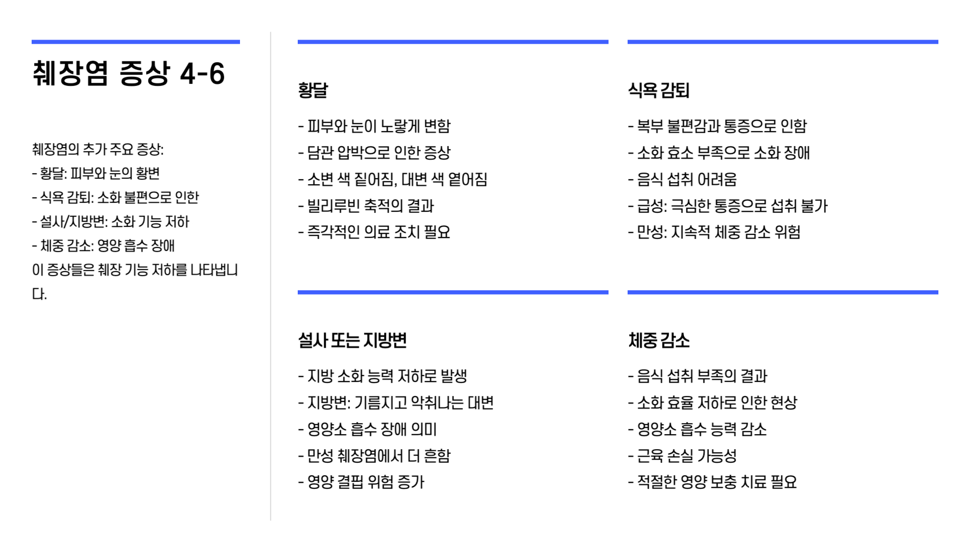 췌장이 부풀어 담관을 압박하면 황달이 발생할 수 있습니다. 피부와 눈이 노랗게 변하며, 회백색 변이나 짙은 색 소변이 나타날 수 있습니다. 황달이 나타나면 즉각적인 진료가 필요합니다.