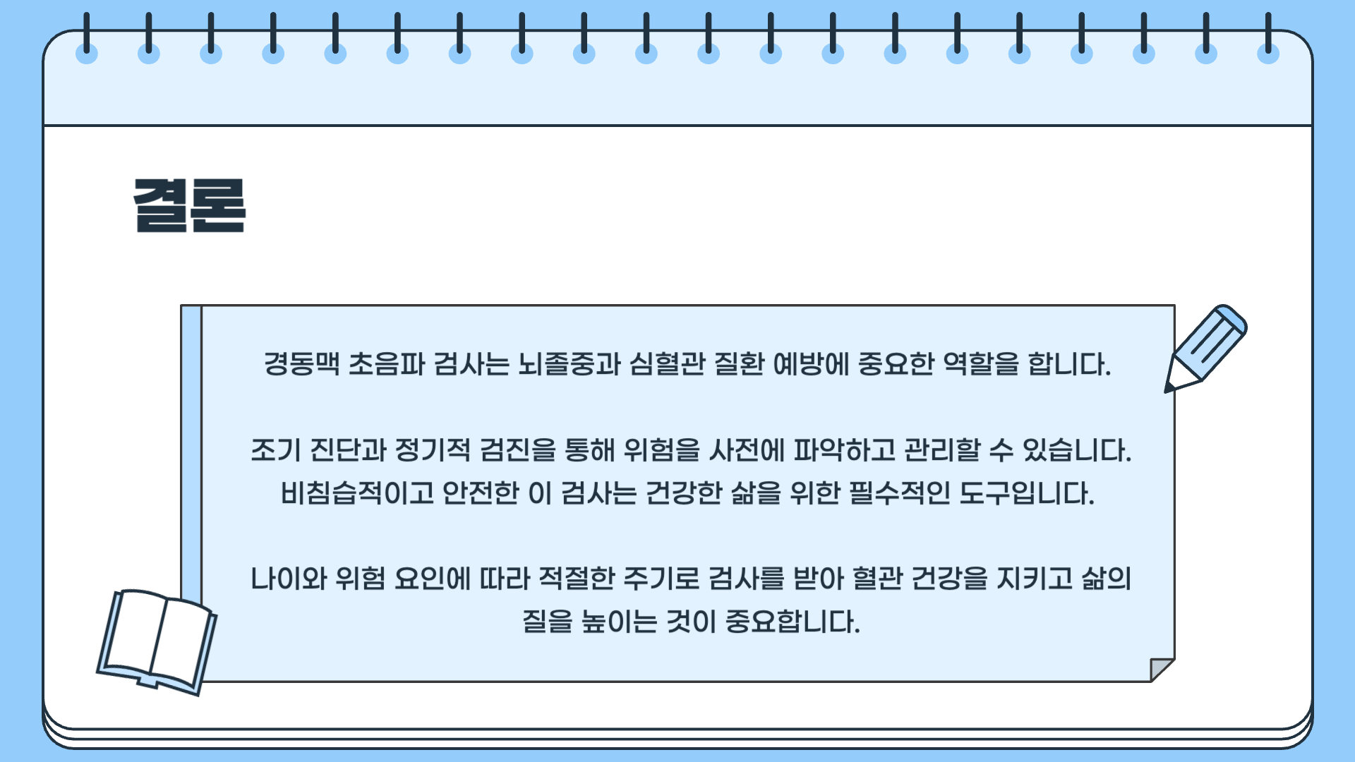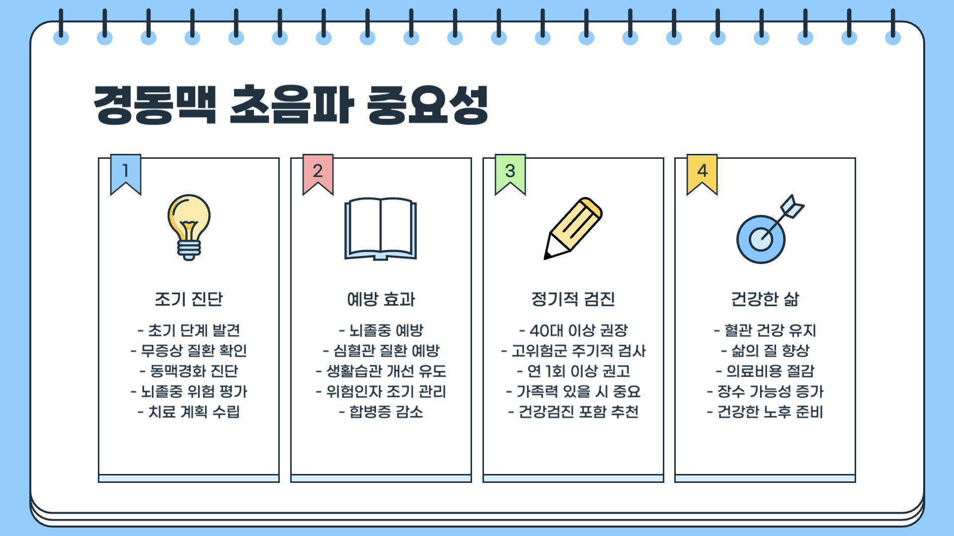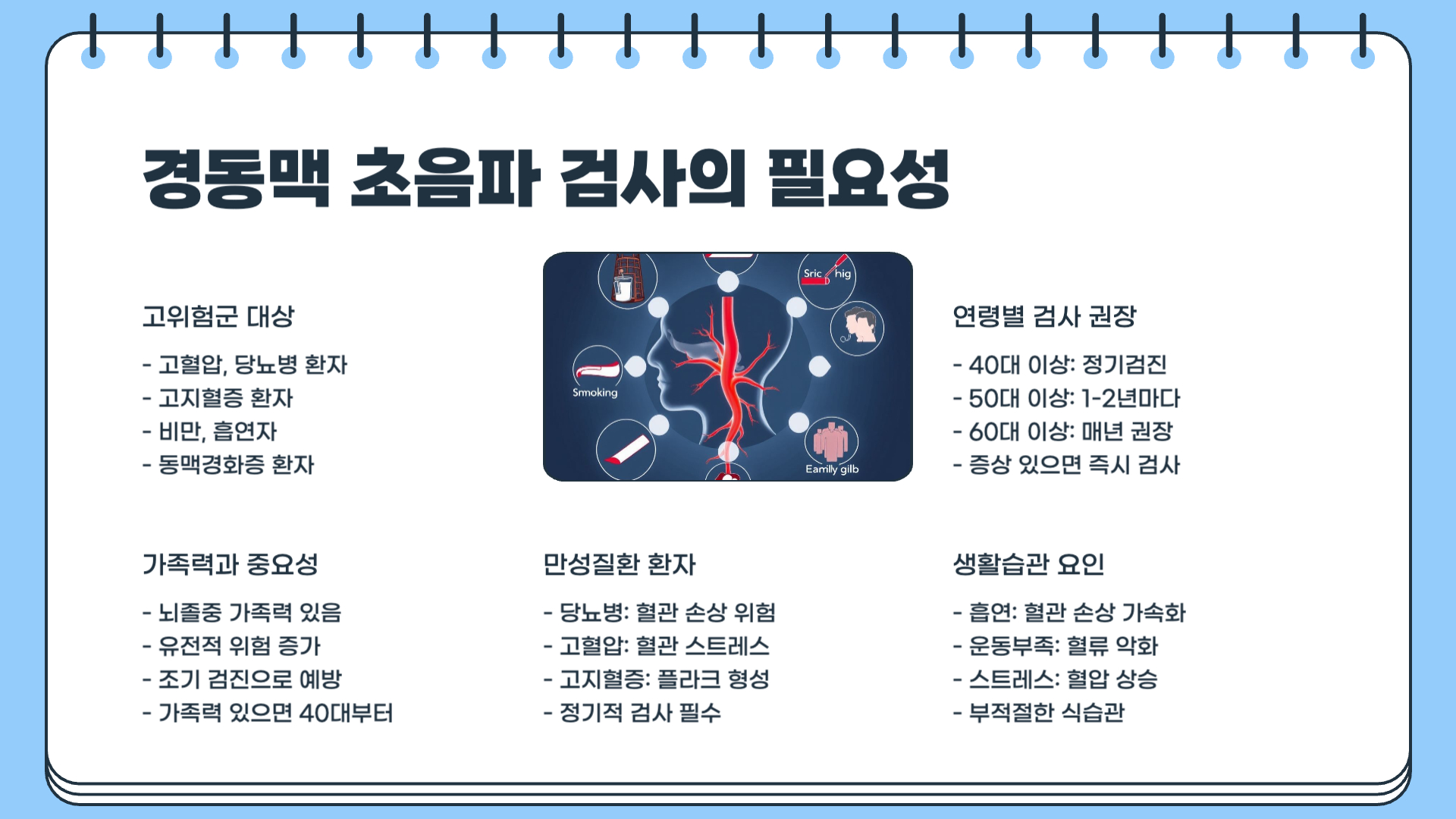 경동맥 초음파 검사는 혈관 건강을 확인하고 뇌졸중과 같은 위험한 질환을 예방하는 데 매우 유용한 검사입니다. 특히 고혈압, 당뇨, 고지혈증 등의 만성 질환이 있거나 가족력이 있는 경우, 정기적인 검사를 통해 조기 진단과 예방이 가능합니다.
