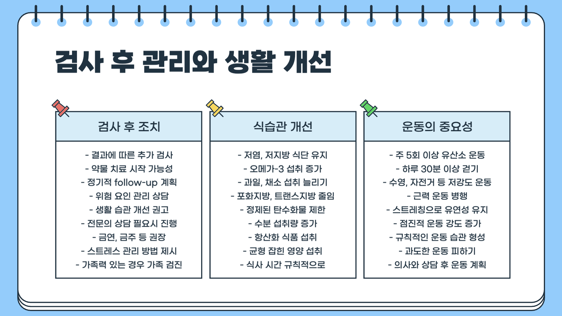 - 50세 이상 성인: 나이가 들수록 혈관 탄력이 떨어지므로 정기적인 검사가 필요합니다.