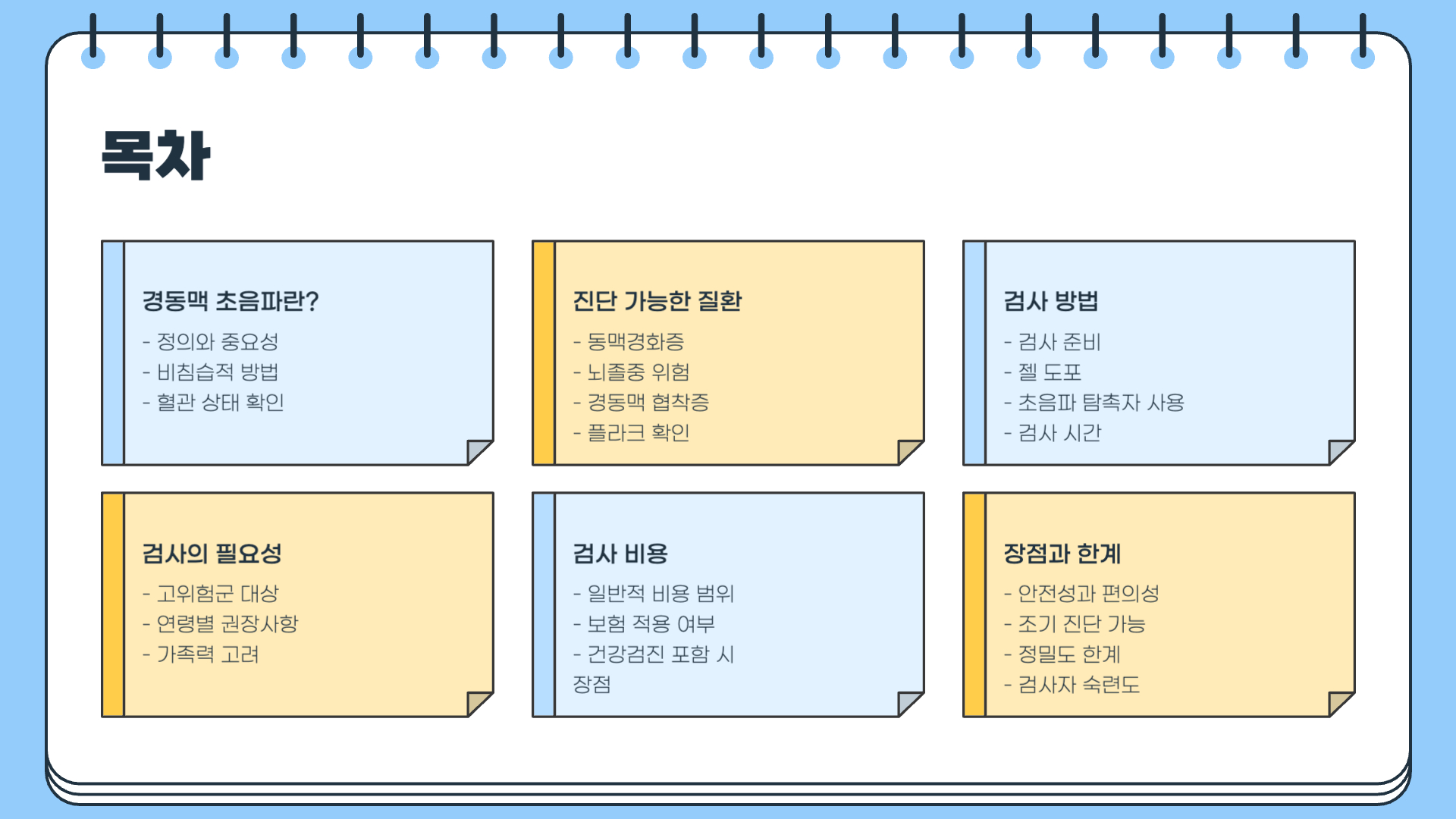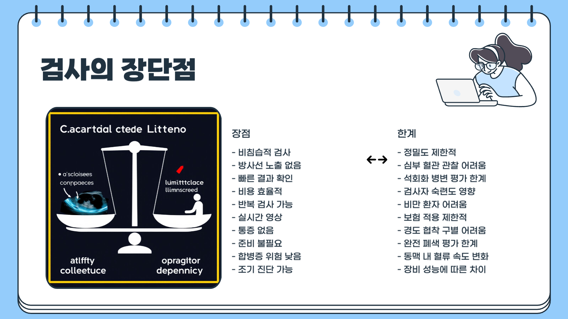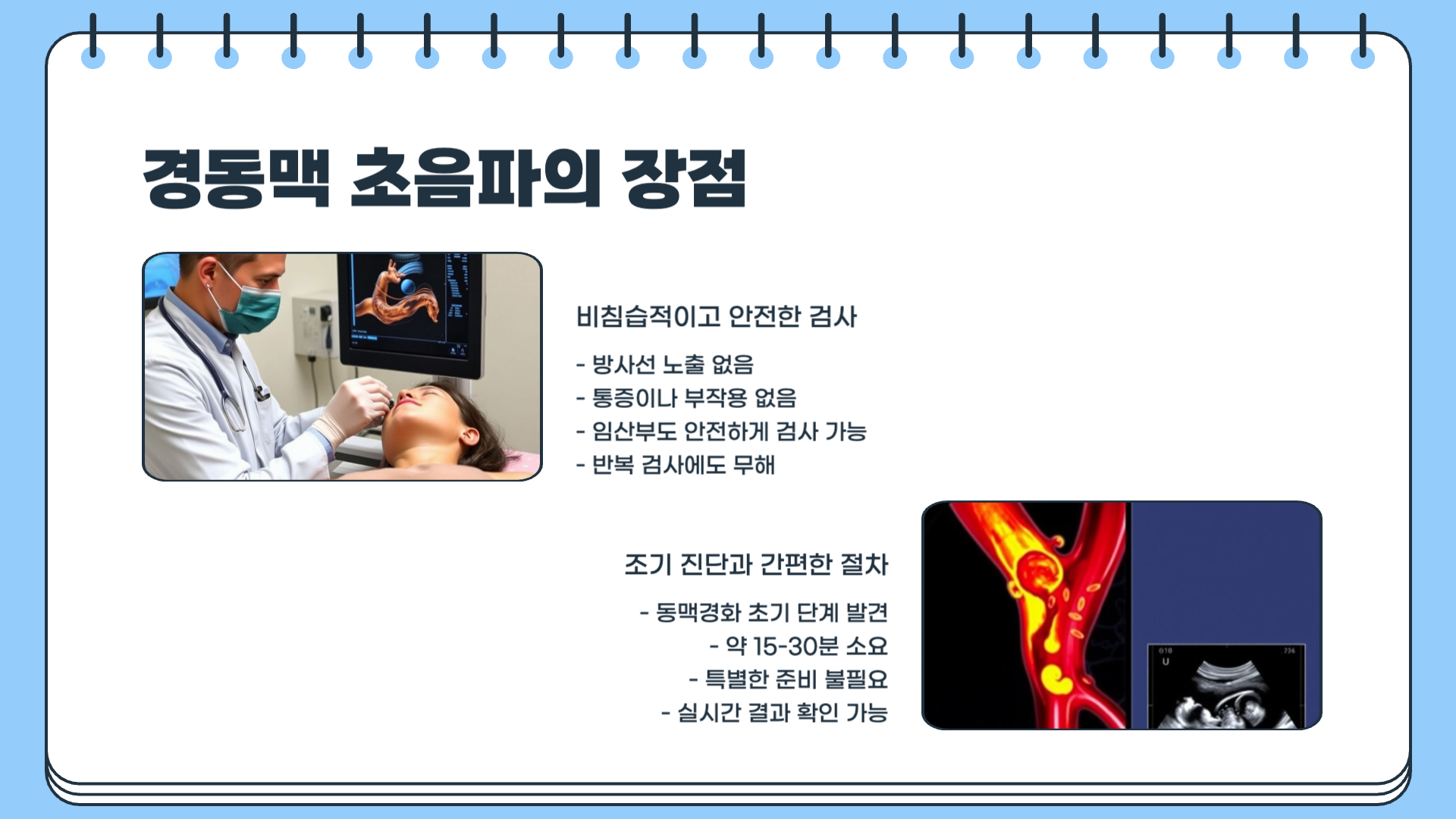 - 혈관 벽 두께 측정: 내막-중막 두께(IMT)를 측정하여 동맥경화 초기 단계를 진단할 수 있습니다.