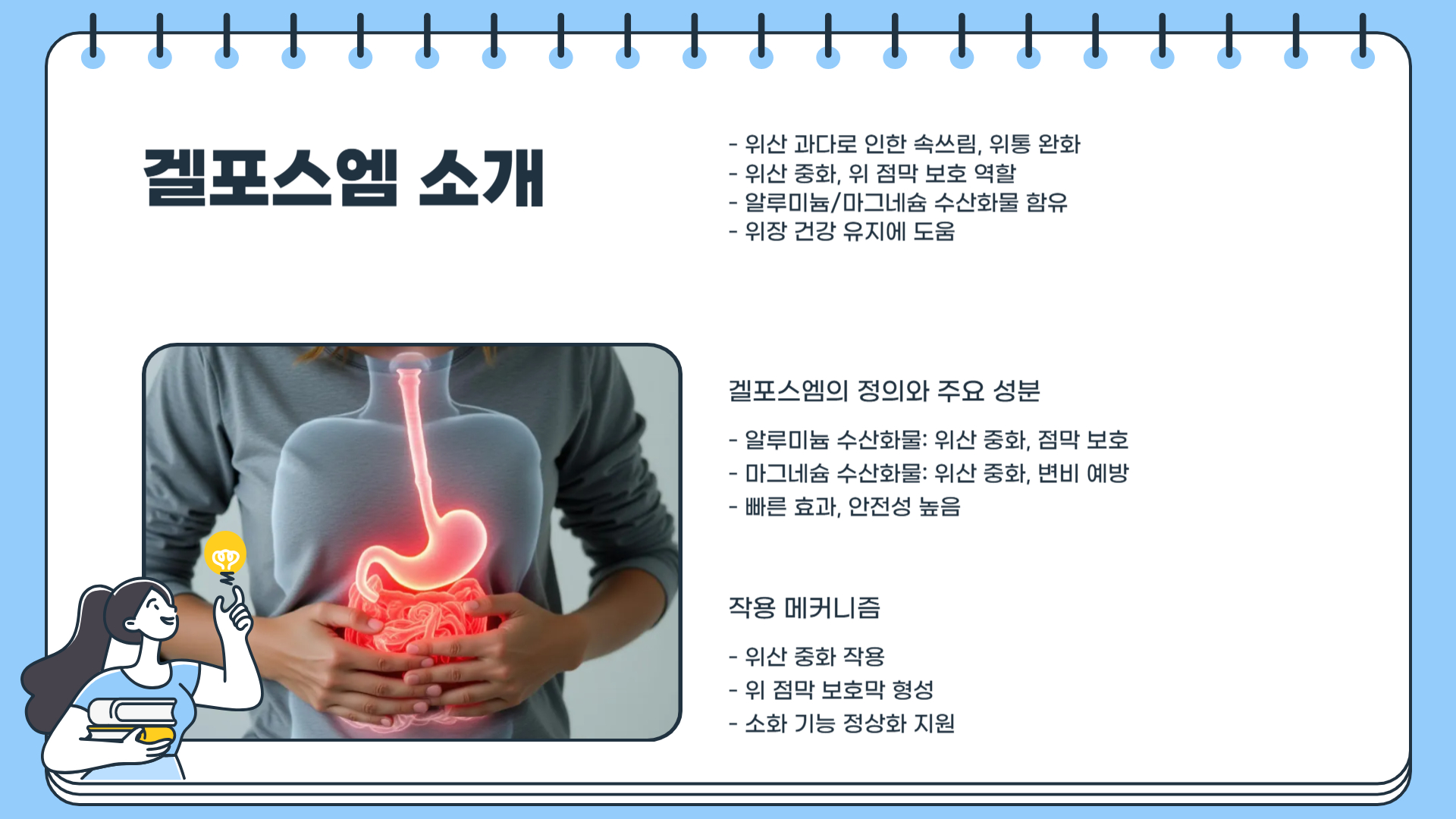 겔포스엠은 위산을 중화하고 위 점막을 보호하는 효과적인 위장약으로, 속쓰림, 위통증, 소화불량 개선에 도움을 줍니다. 복용 시 용량을 지키고, 장기간 복용 전에는 전문가와 상담하는 것이 중요합니다.