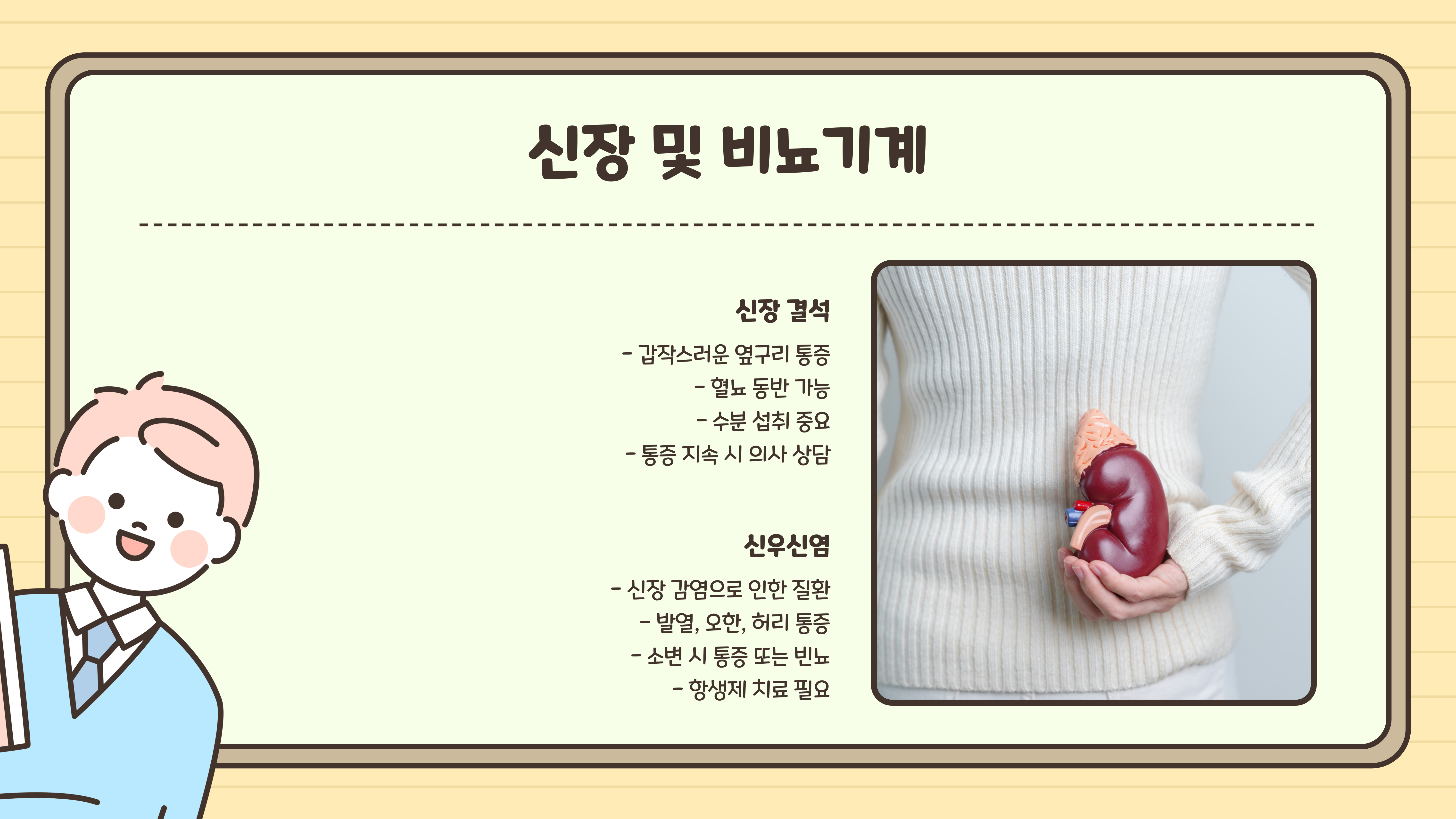 - 신우신염 – 신장 감염으로 인해 발열, 허리 통증, 배뇨 시 통증이 나타날 수 있습니다.