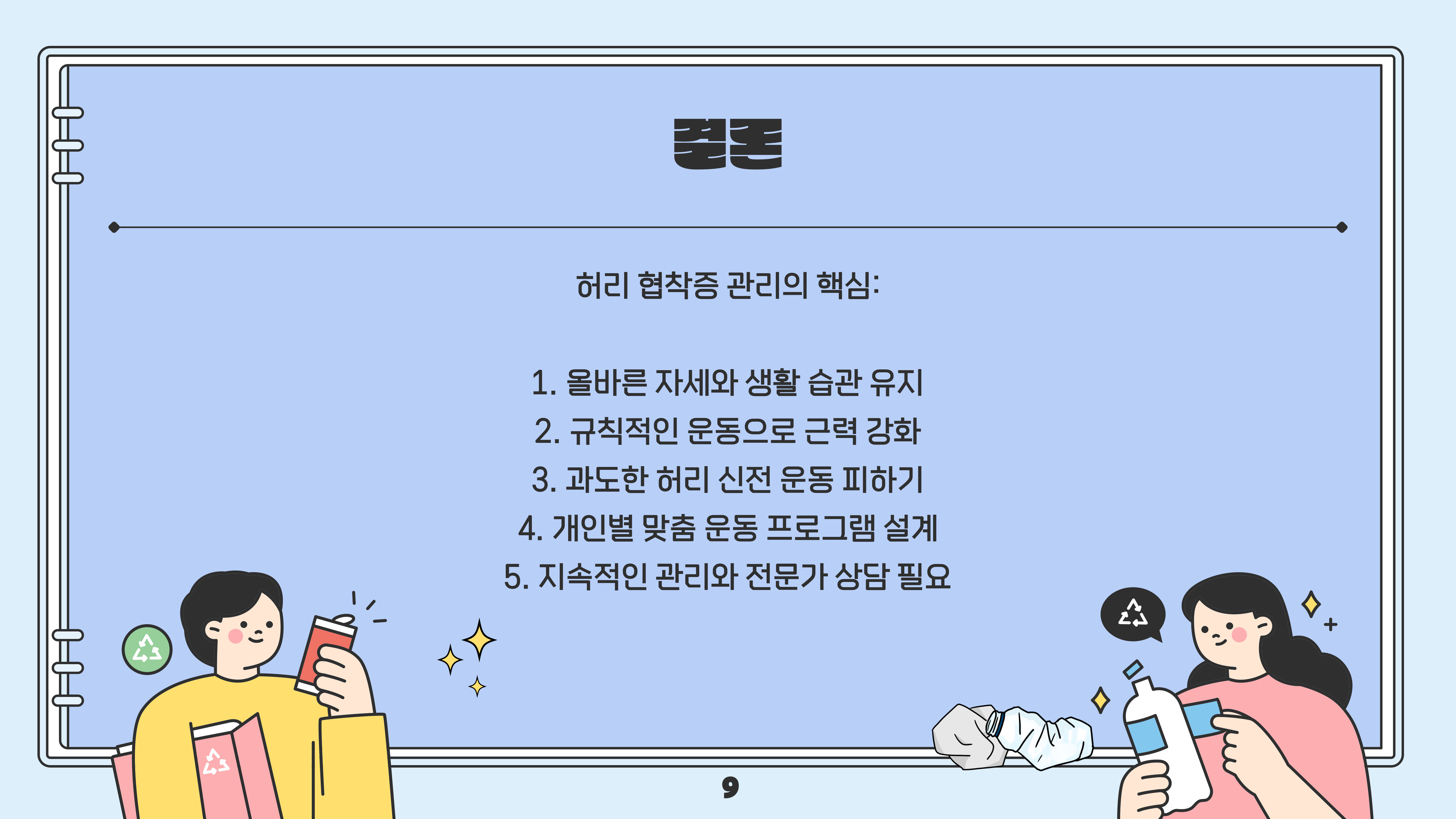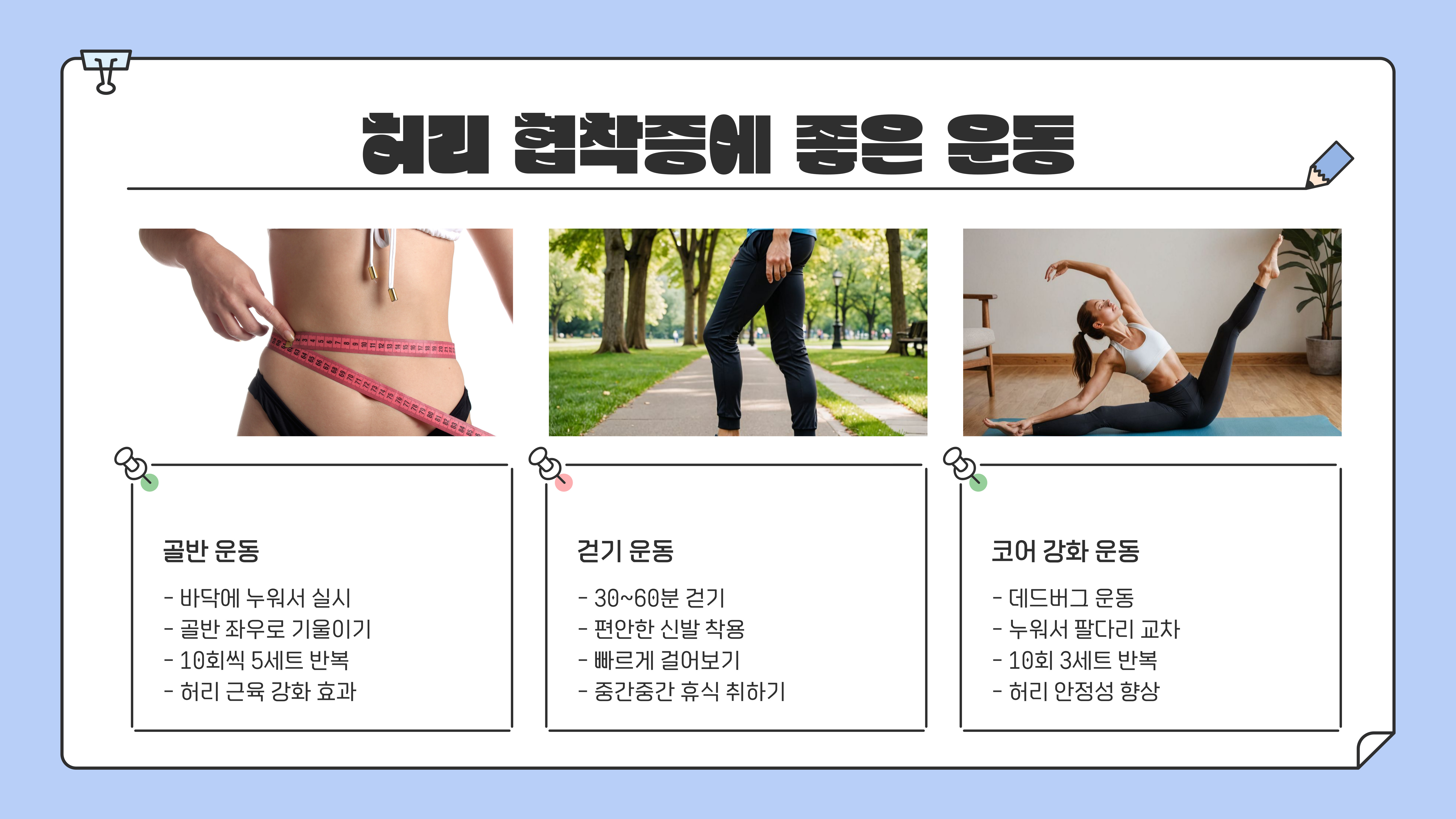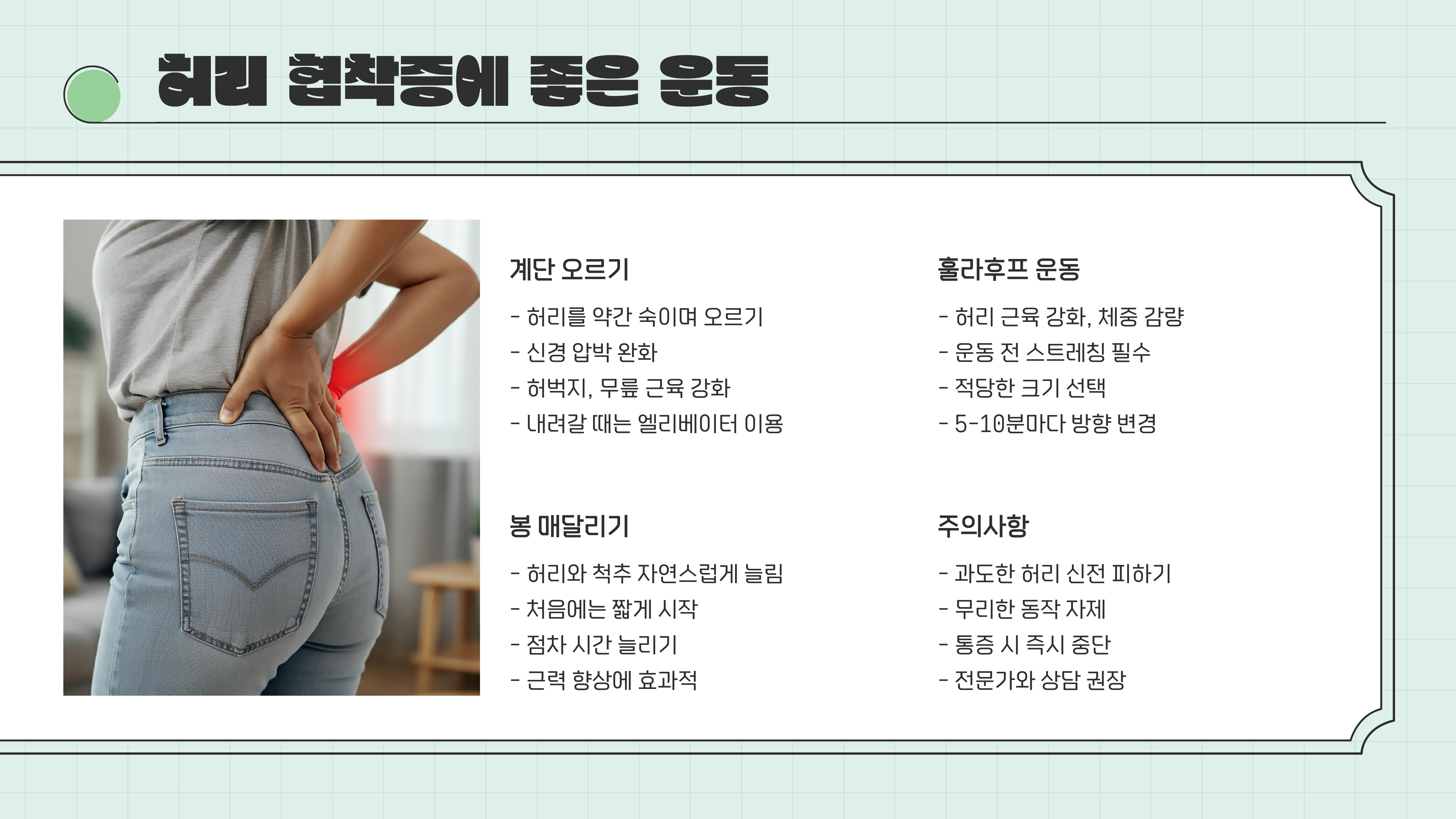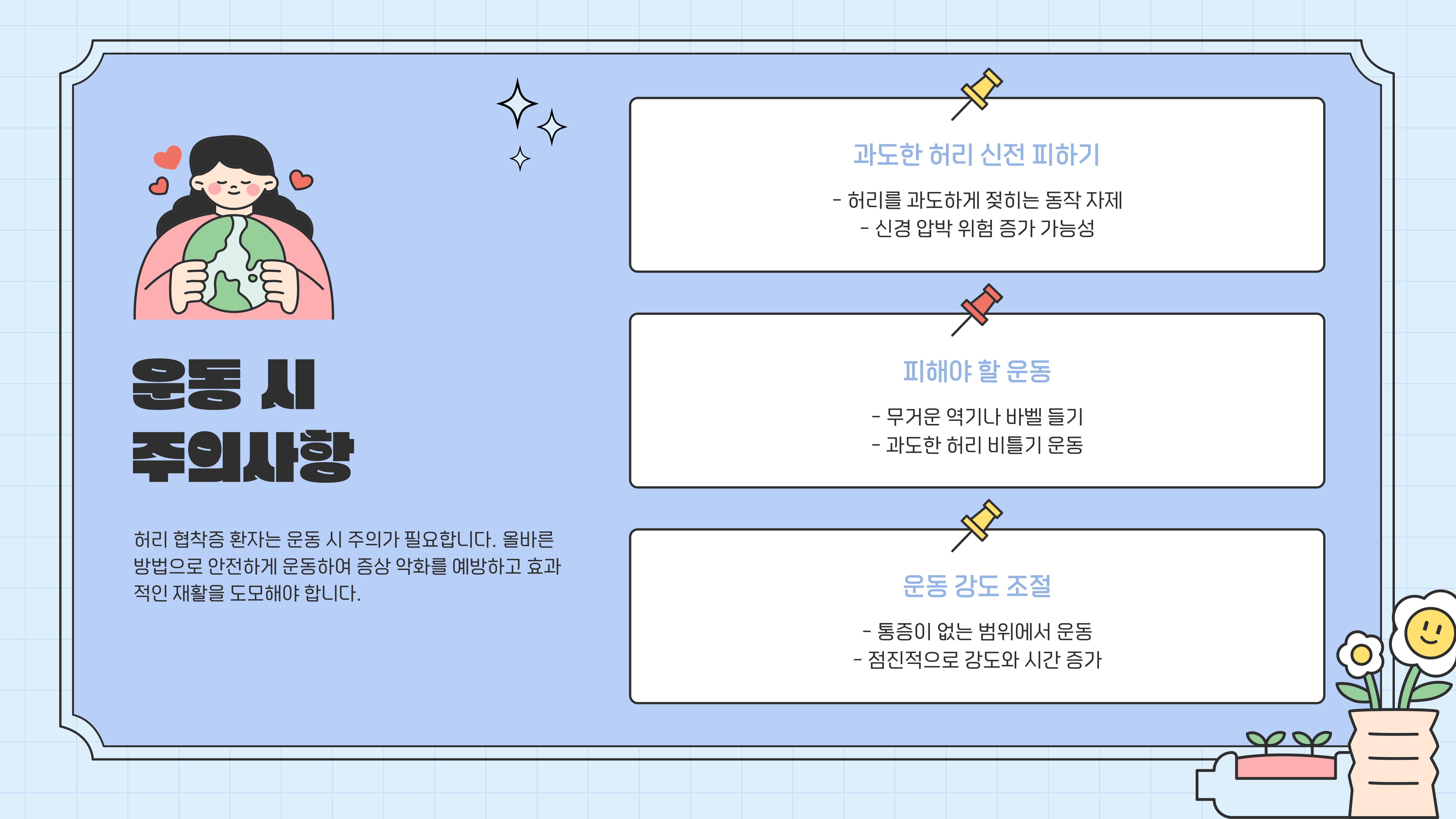 운동 시 무리하지 않는 범위 내에서 진행하며, 증상이 심해지면 반드시 전문가와 상담하는 것이 중요합니다. 규칙적인 운동을 통해 건강한 허리를 유지하세요!