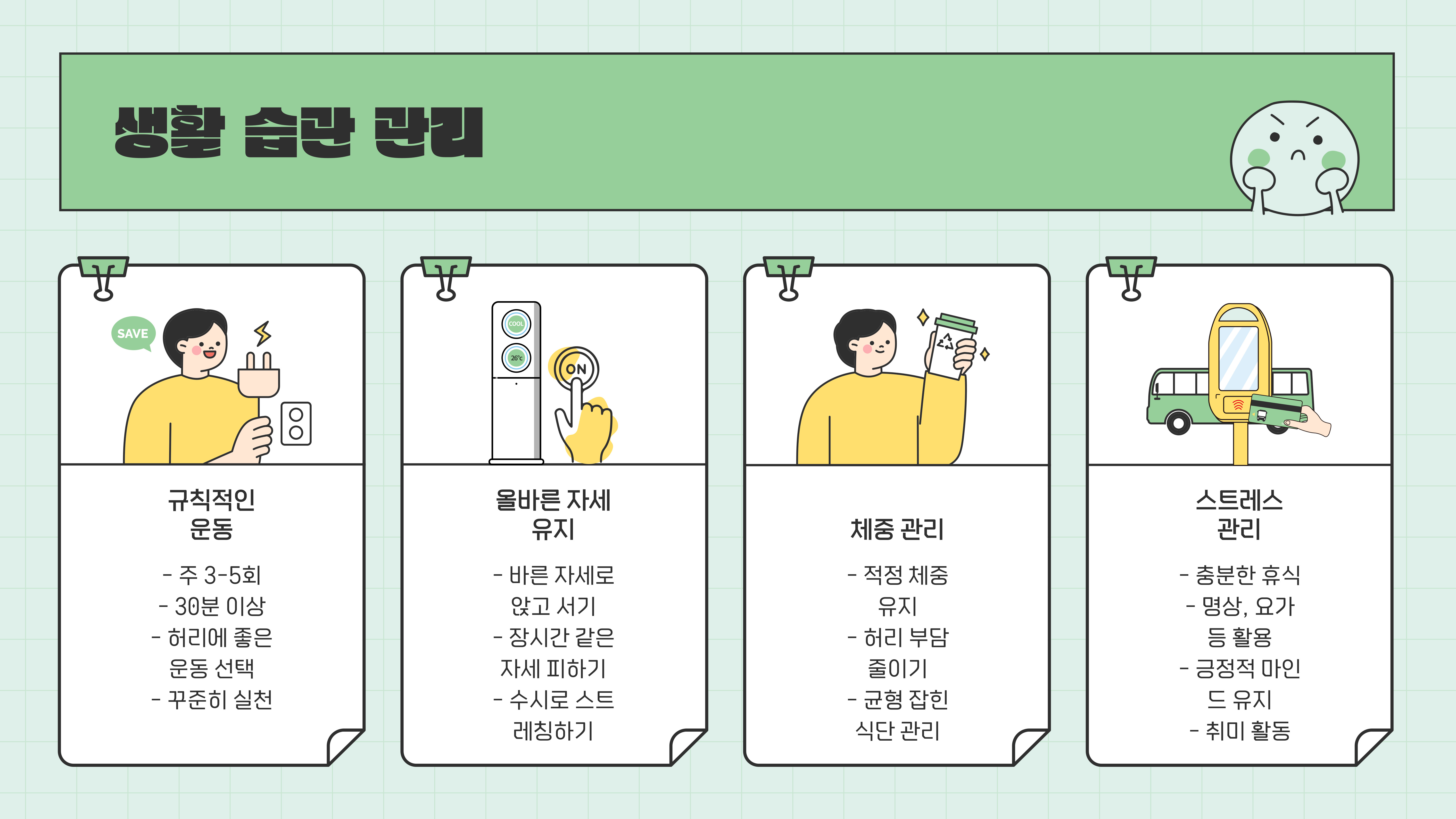 • 서 있을 때: 허리를 바르게 펴고 목과 등이 무너지지 않도록 신경 쓰기