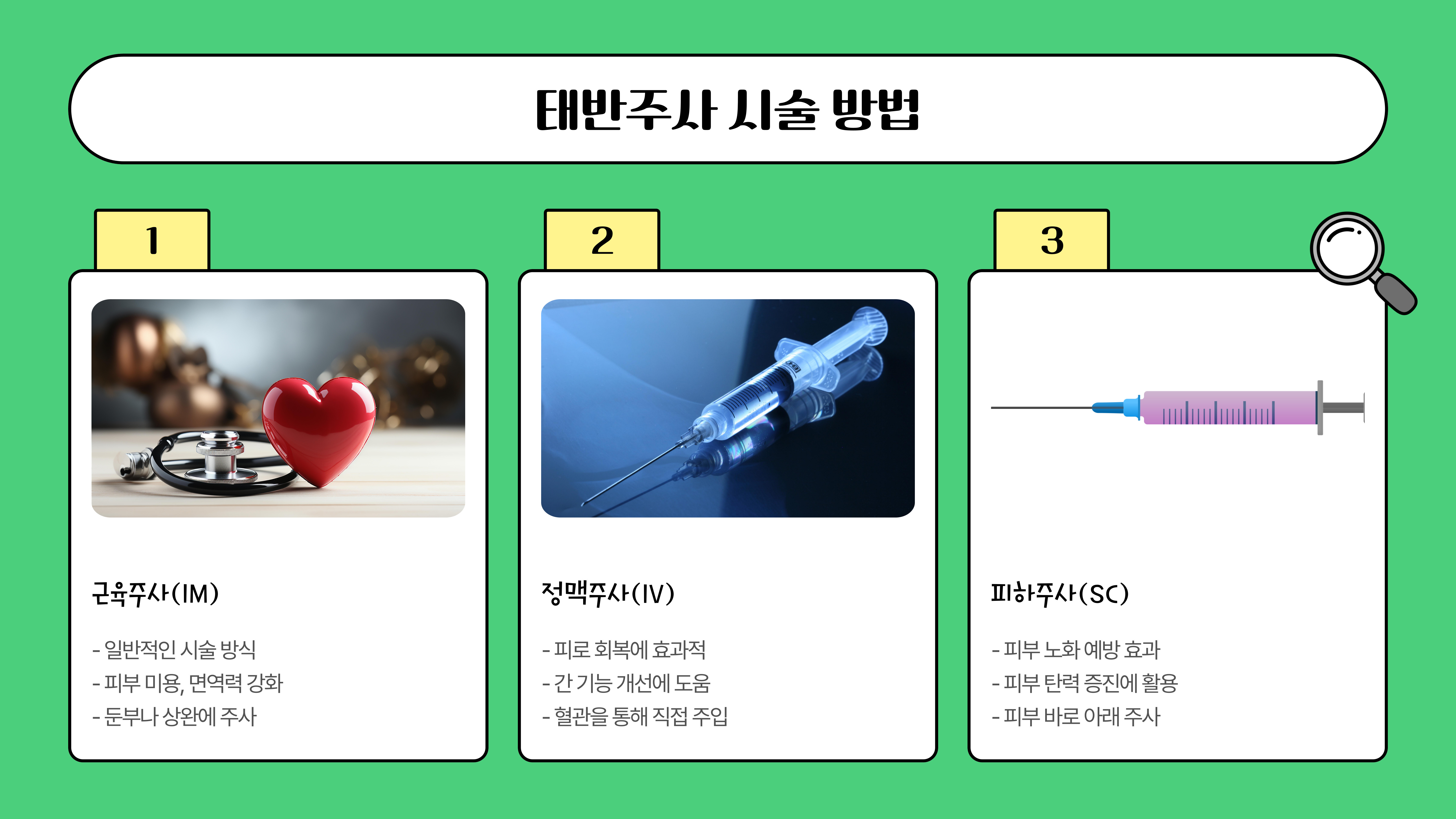 - 근육주사(IM): 피부 미용 및 면역력 강화를 위한 일반적인 방식