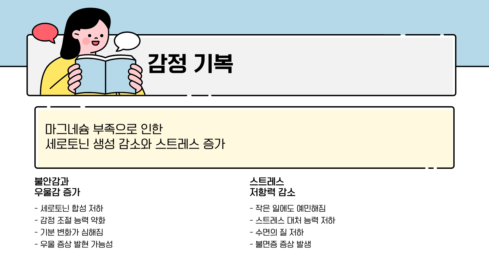 마그네슘은 신경전달물질인 세로토닌 생성에 관여하여 감정 조절에 중요한 역할을 합니다. 세로토닌이 부족하면 불안감, 우울감, 스트레스가 증가할 수 있으며, 마그네슘이 부족할 경우 이 증상이 심화될 수 있습니다.