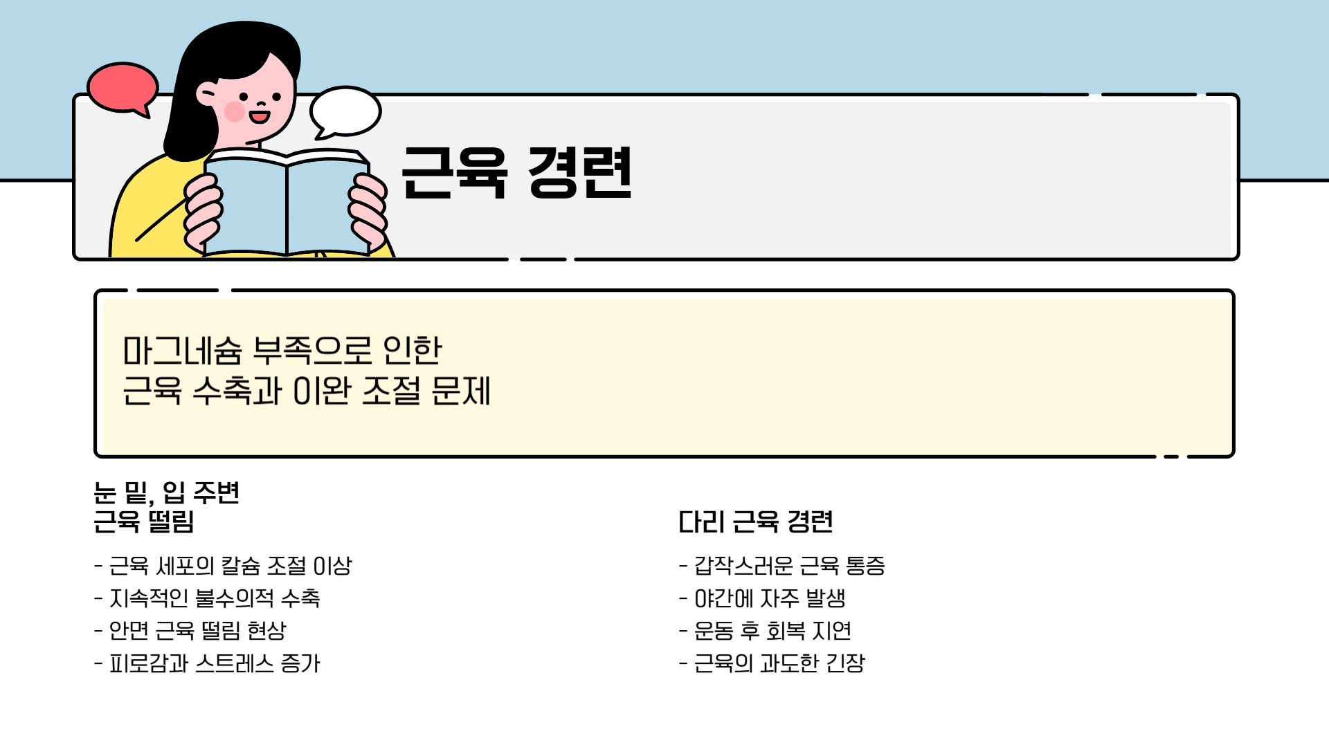 마그네슘은 근육의 수축과 이완을 조절하는 역할을 합니다. 마그네슘이 부족하면 근육이 과도하게 수축하여 경련이 발생할 수 있으며, 특정 부위의 근육이 떨리는 증상도 나타날 수 있습니다.