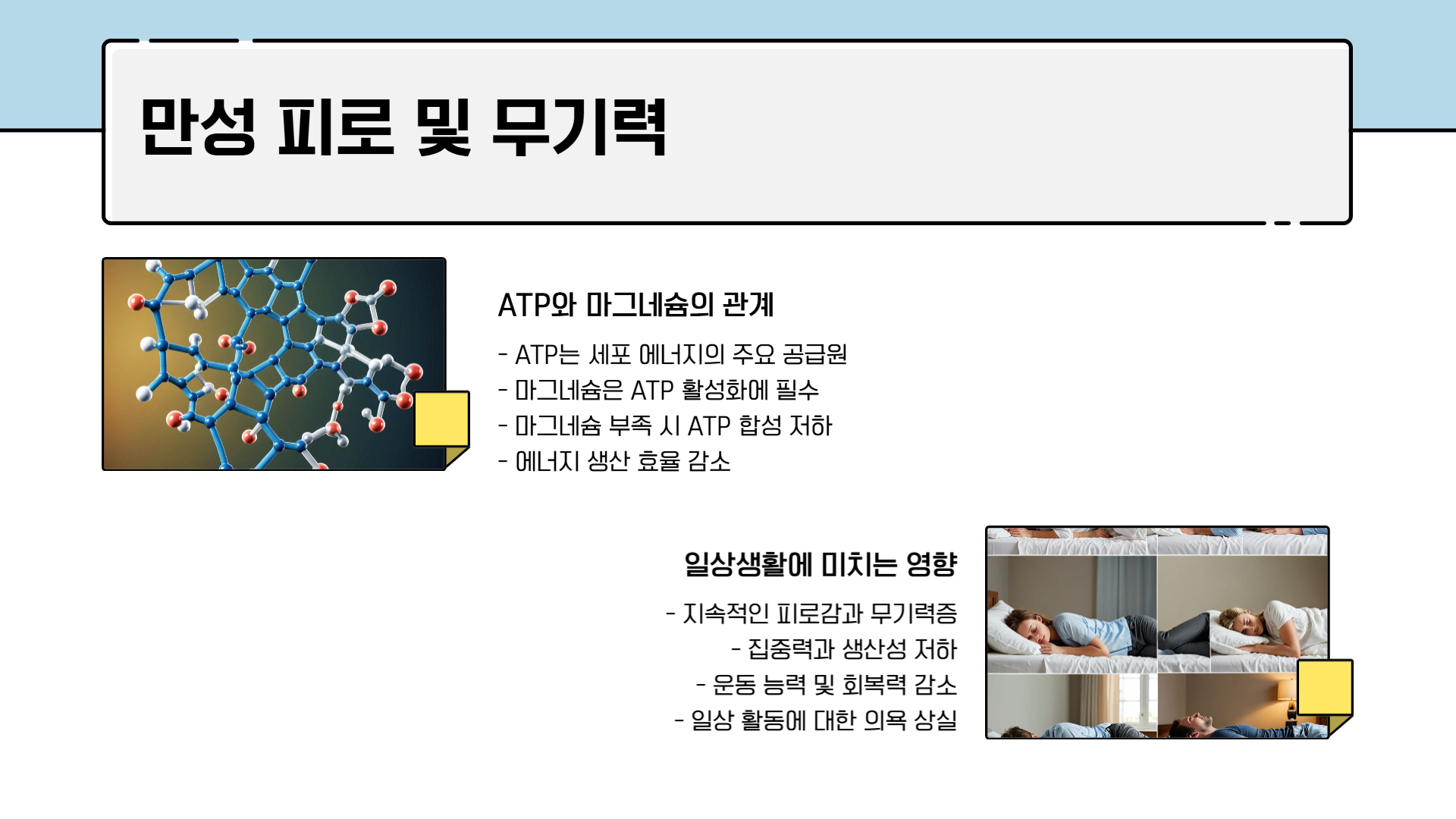 마그네슘은 에너지 생성 과정에서 중요한 역할을 합니다. ATP(아데노신 삼인산)는 세포 에너지의 주요 공급원으로, 마그네슘이 충분해야 원활한 에너지 생산이 가능합니다. 그러나 마그네슘이 부족하면 ATP 합성이 저하되어 만성적인 피로감, 무기력함, 집중력 저하 등의 증상이 나타날 수 있습니다.