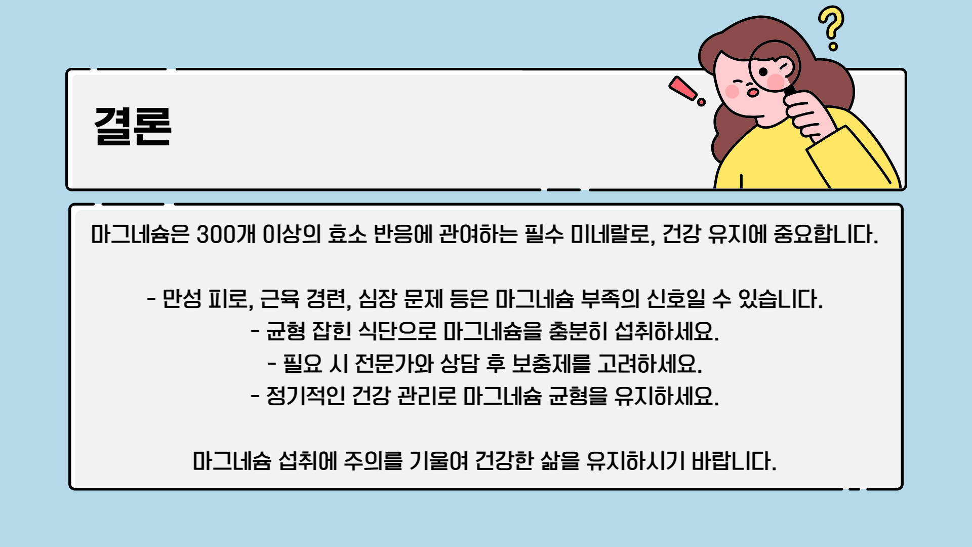 마그네슘은 신체 기능을 유지하는 데 필수적인 미네랄이며, 부족할 경우 피로, 근육 경련, 심혈관 문제, 감정 기복 등의 다양한 증상이 나타날 수 있습니다. 건강한 식습관을 통해 마그네슘을 충분히 섭취하고, 필요 시 영양제로 보충하여 건강을 유지하는 것이 중요합니다. 정기적인 건강 관리와 균형 잡힌 식단을 통해 마그네슘 결핍을 예방하고 건강한 삶을 유지하시길 바랍니다.